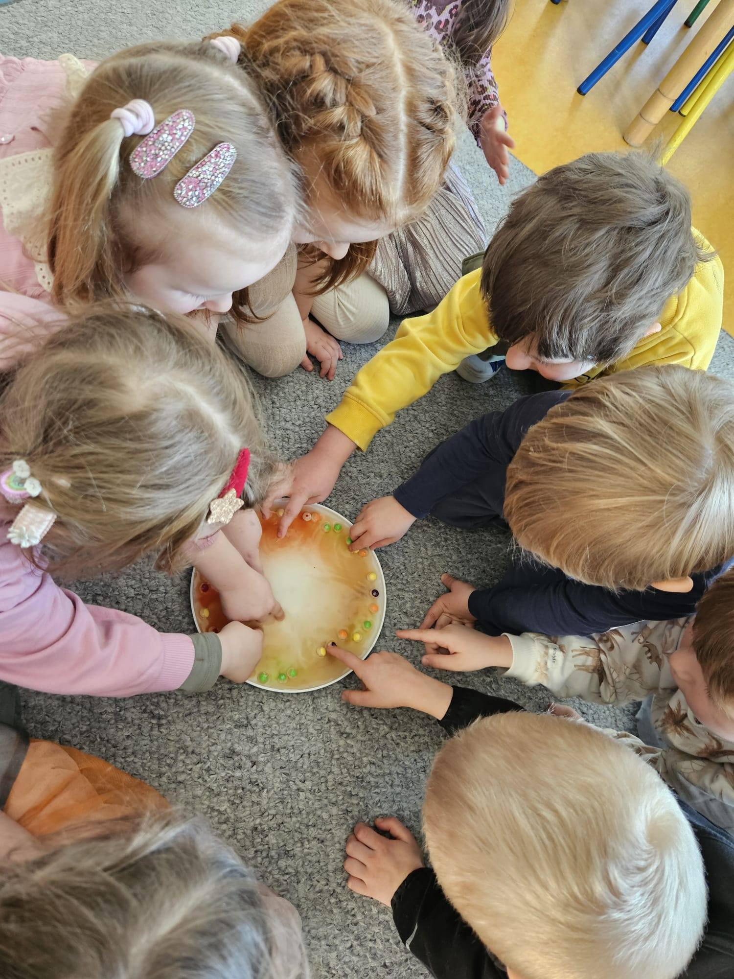 Dziś natomiast Jeżyki rozpoczęły od sprawdzenia jak woda reaguje na słodycze, które dzieci chętnie zjadają. Kolorowa tęcza była przepiękna…