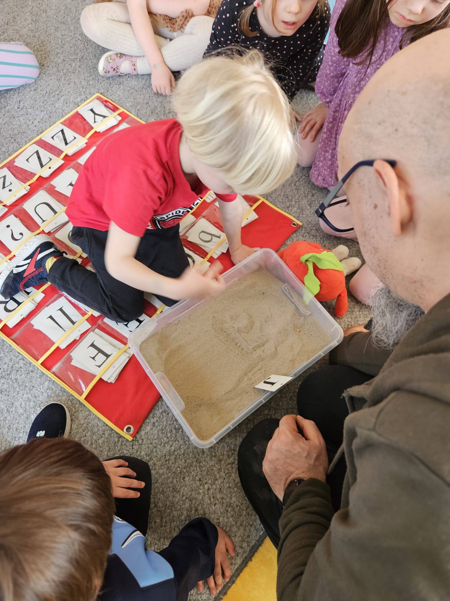 Jeżyki miały wstęp do grafomotoryki. Wspólnie próbowaliśmy odgadnąć pierwsze litery naszych imion a potem paluszkiem na piasku je odwzorować…