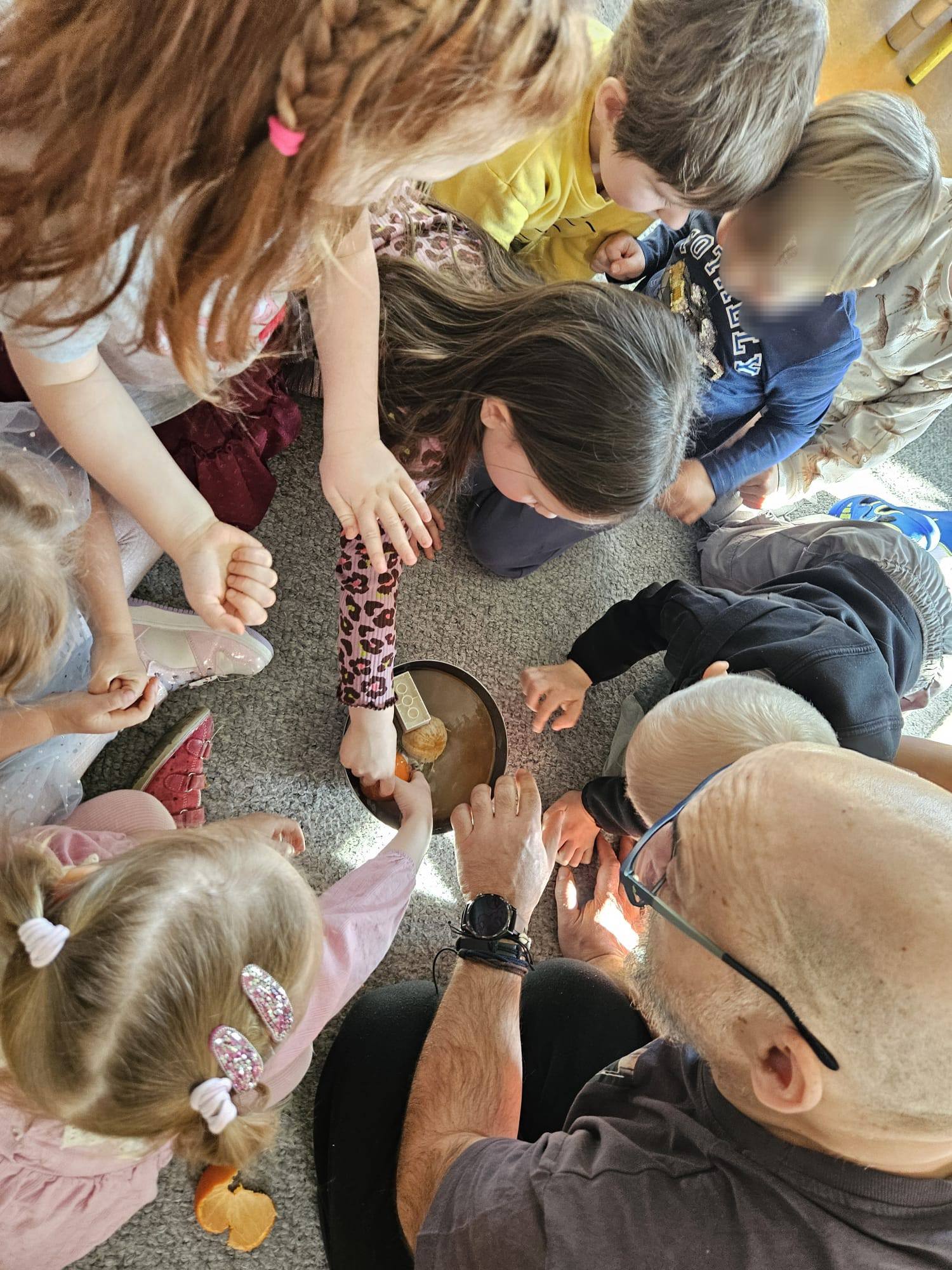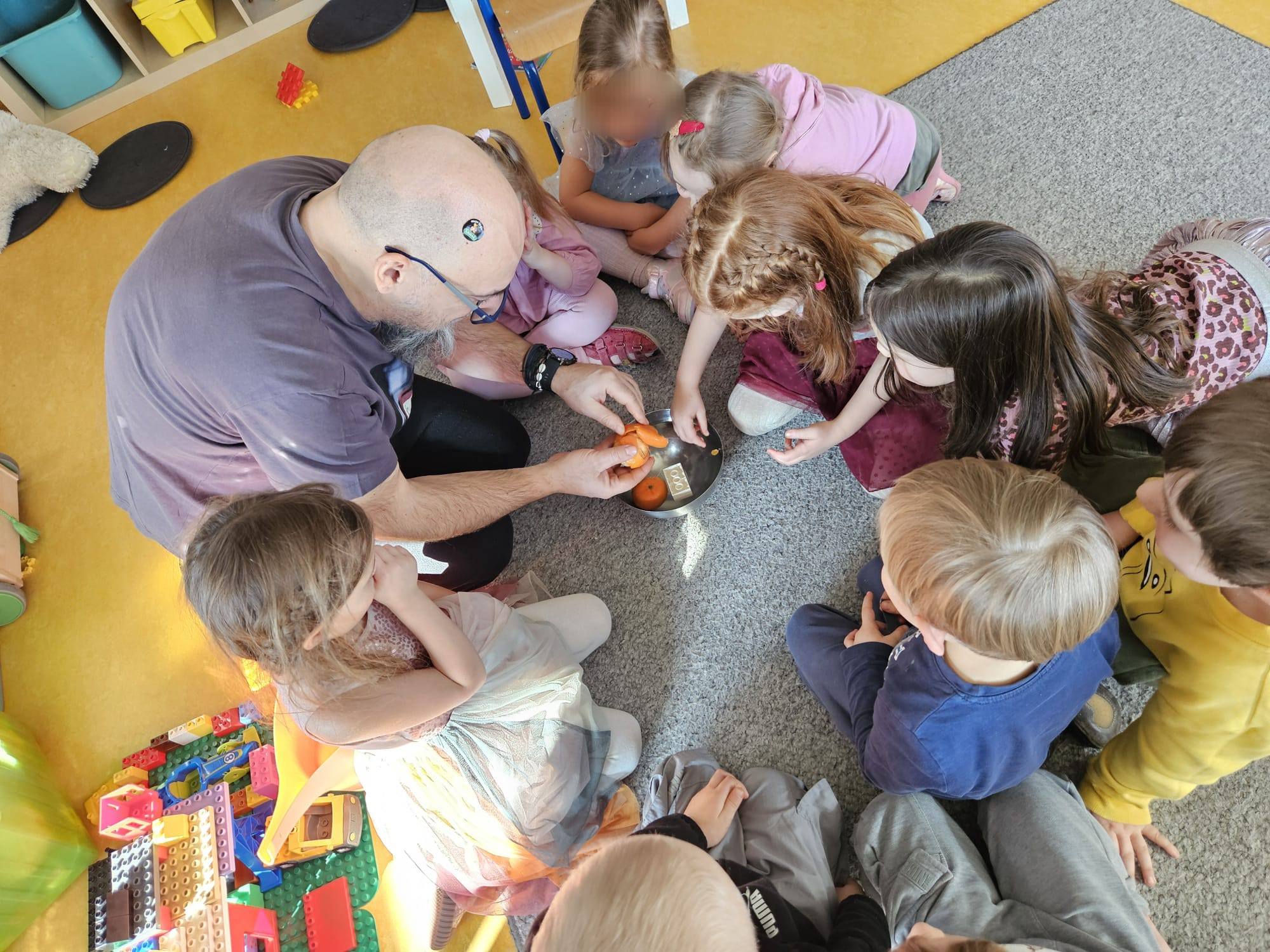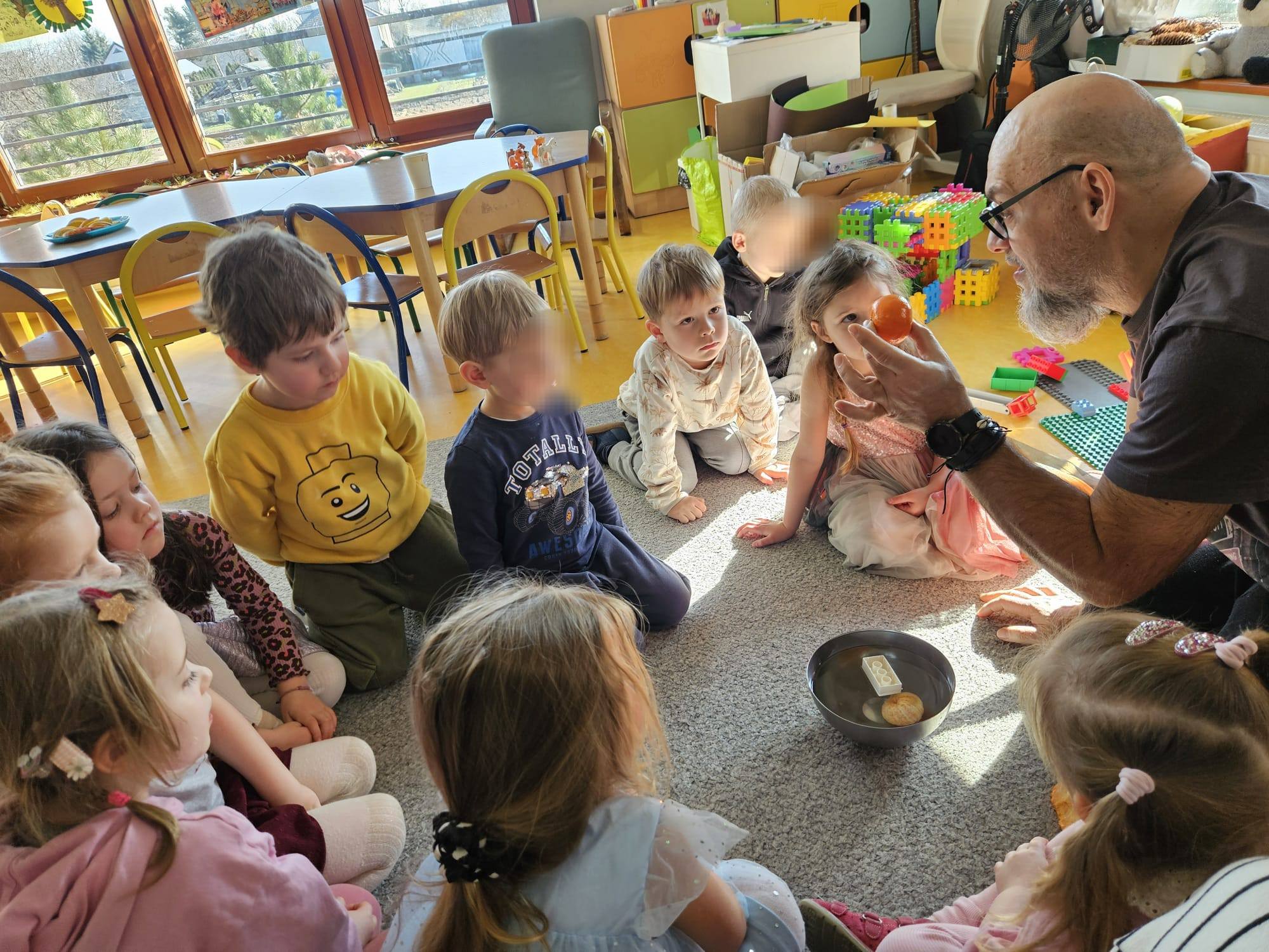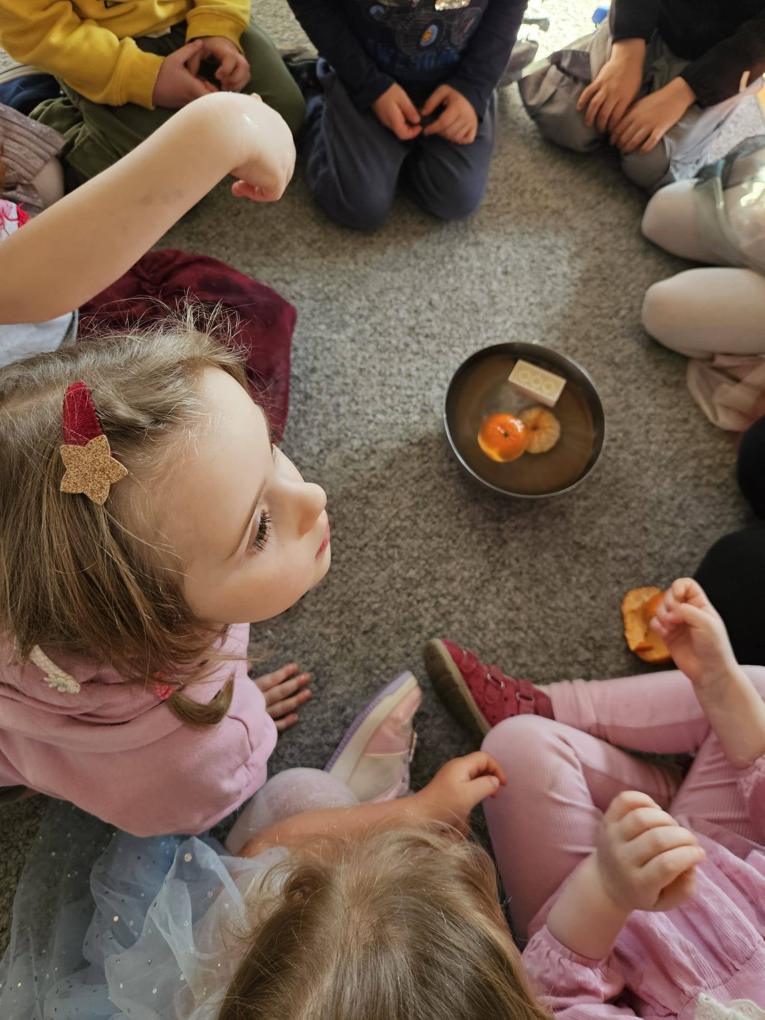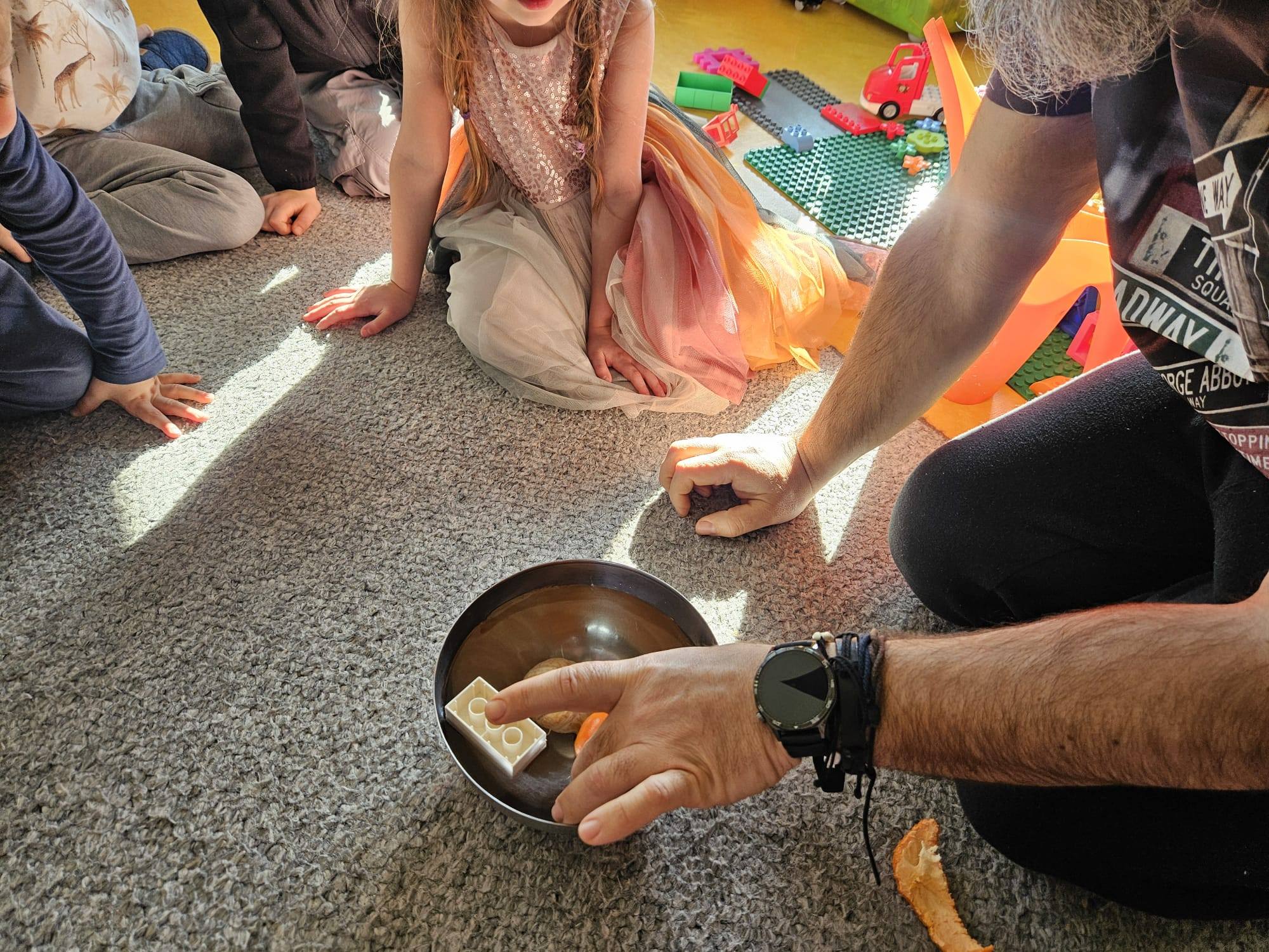 A drugi eksperyment opowiadał o wyporność i utrzymywaniu się na wodzie mandarynek. Jeżyki porównały to doświadczenie do działania kamizelki ratunkowej, którą zakładamy pływając na łódce, rowerze wodnym czy kajaku 🙂