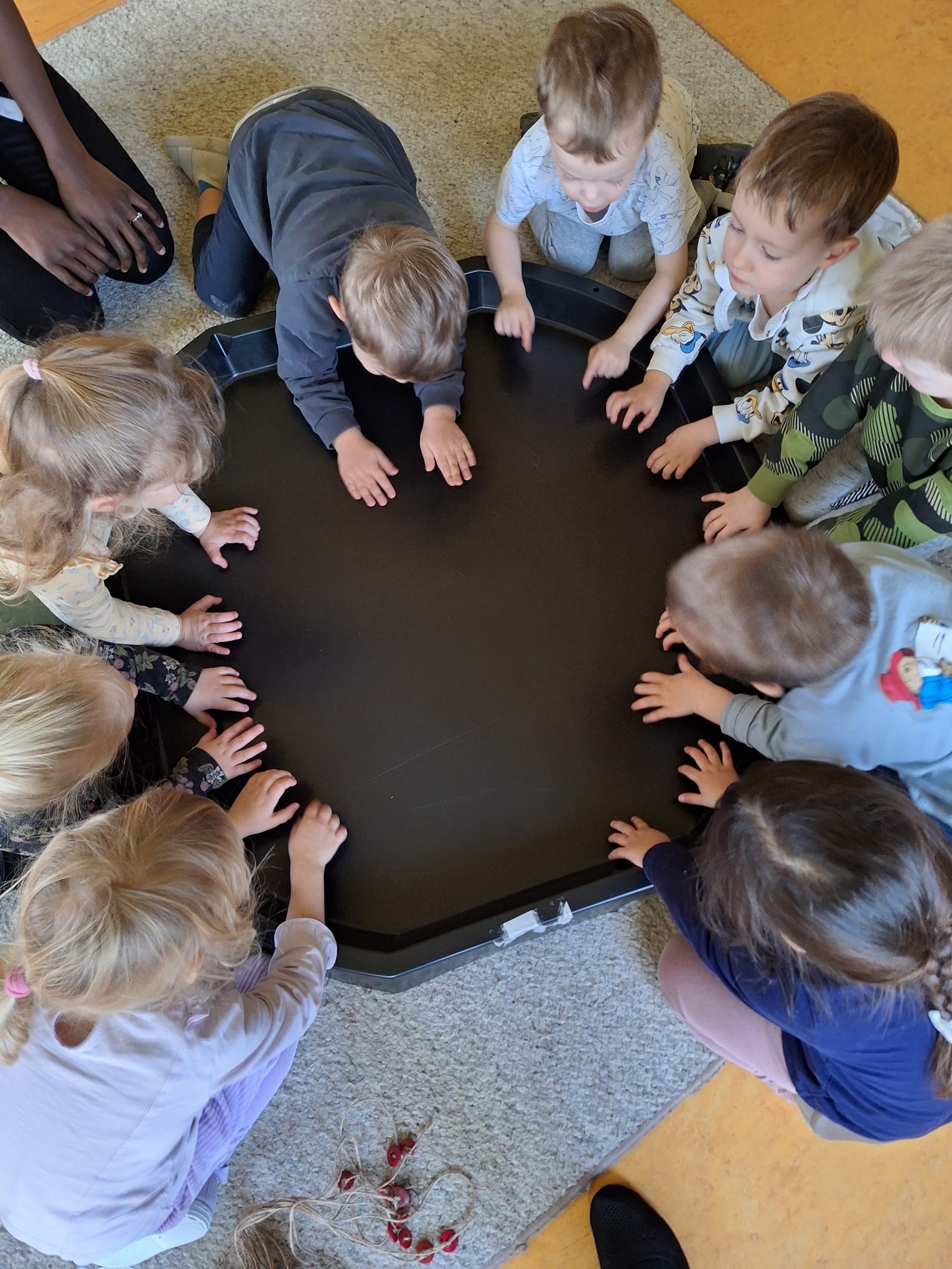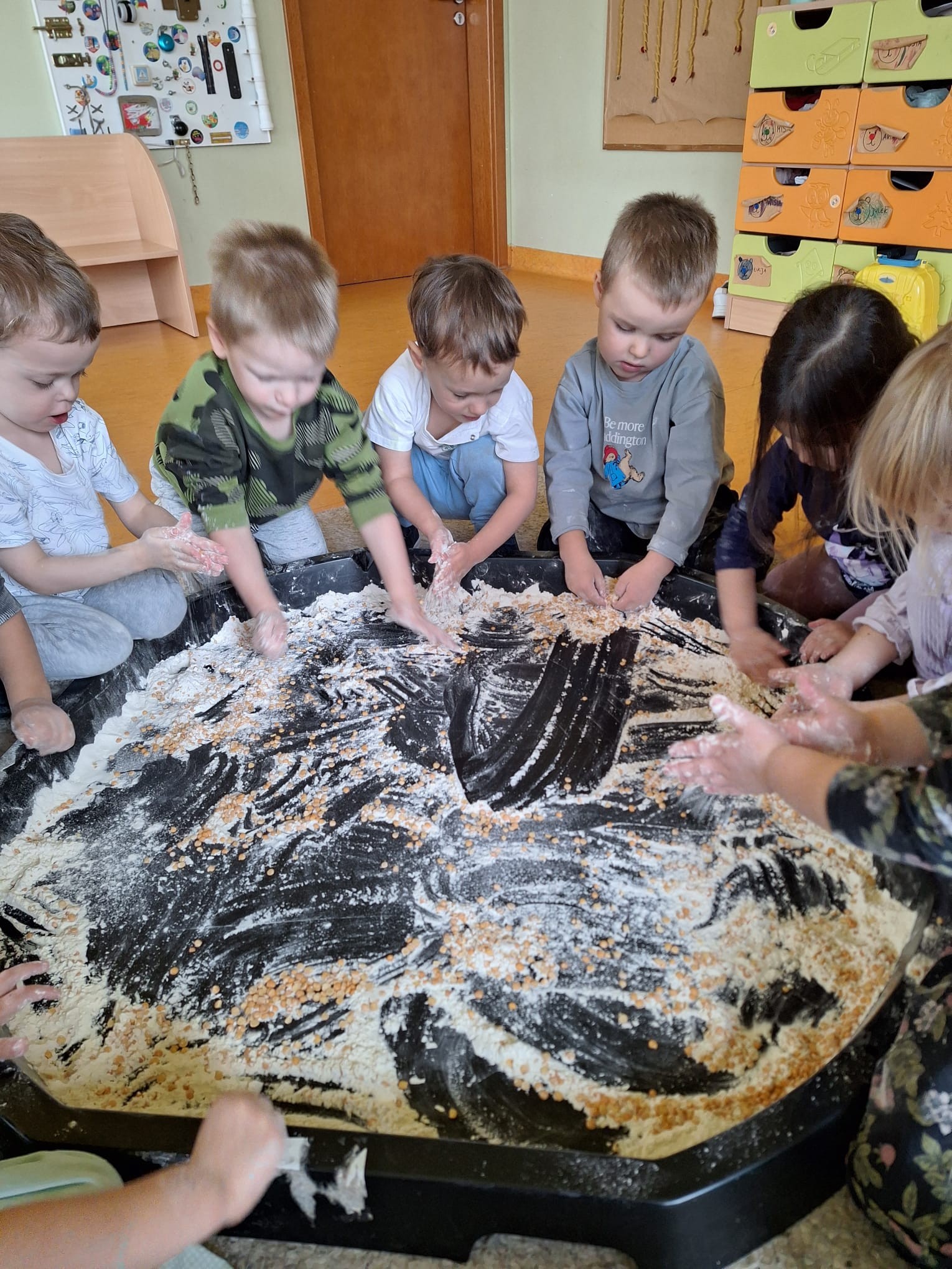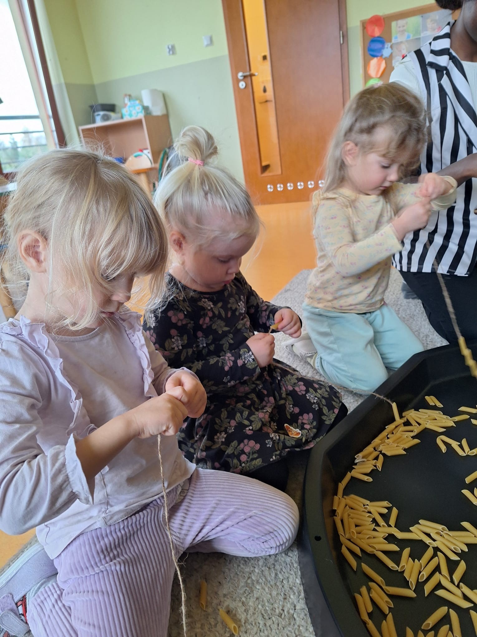 Misie rozmawiają w tym tygodniu o poznawaniu świata za pomocą różnych zmysłów. Dzisiaj zabawy sensoryczne związane z dotykiem (nawlekaliśmy nakaron na sznurki, rysowaliśmy na mące) i słuchem (sprawdziliśmy jak szumi i stuka makaron albo ziarenka ziela angielskiego) 🙂