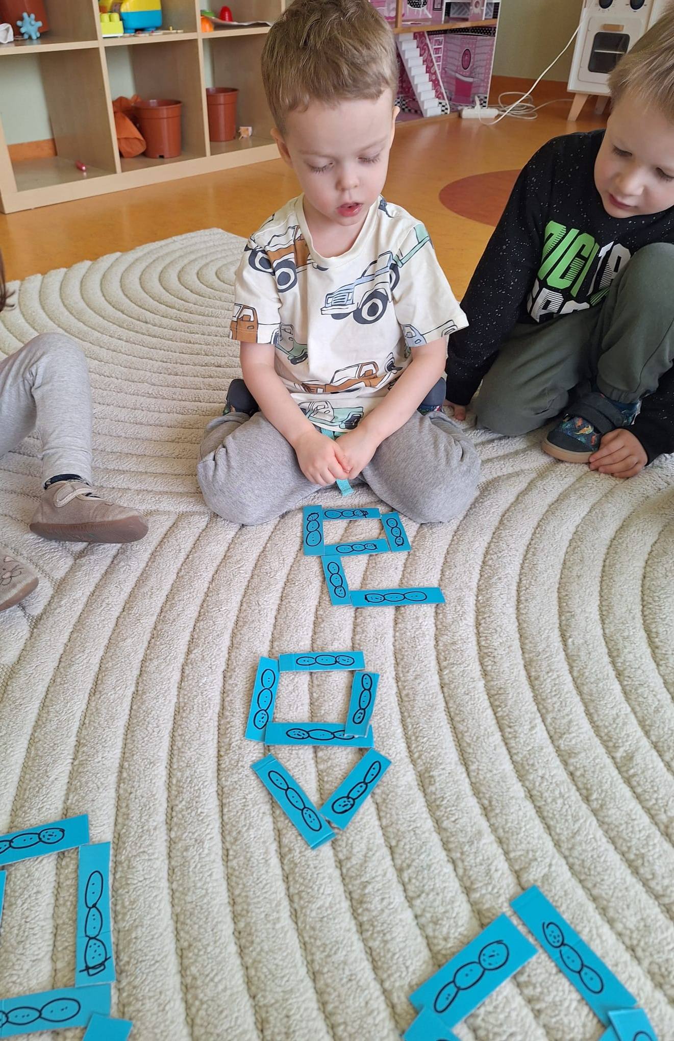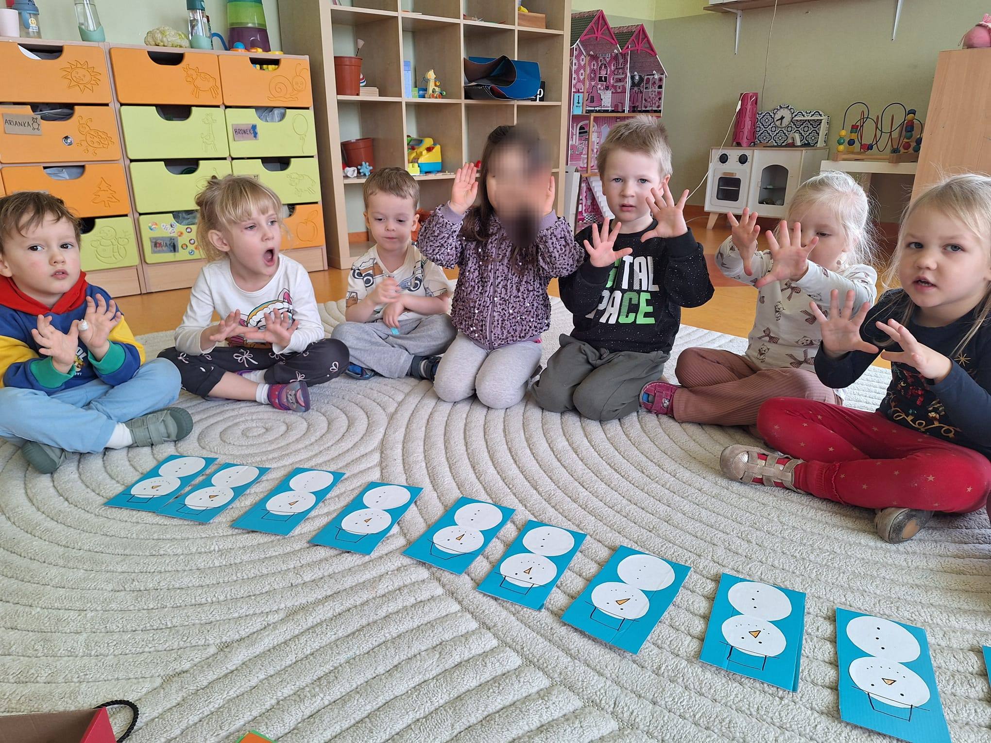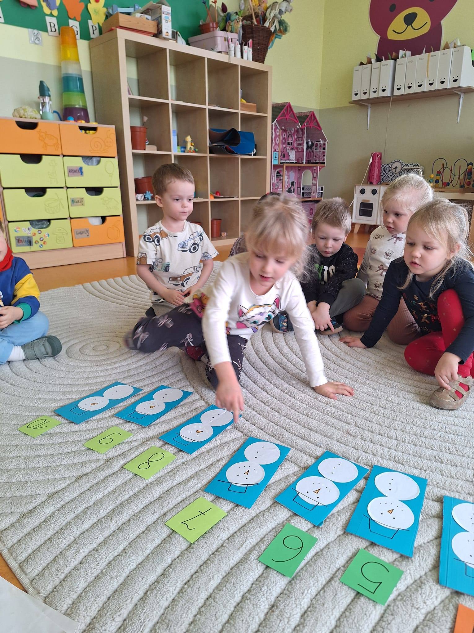 Misie zainspirowały się bajką „Dziesięć balwanków” W. Chotomskiej. Przeliczamy oczka na koste i odejmujemy bałwanki, układamy obrazki wg wzoru 🙂