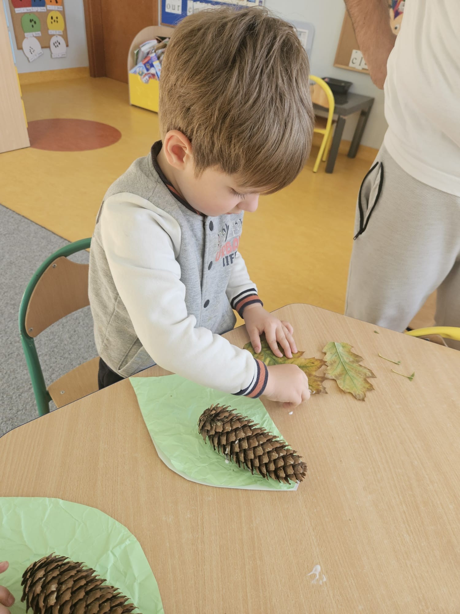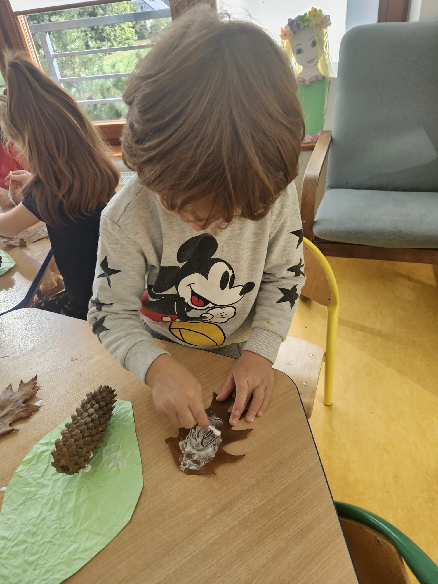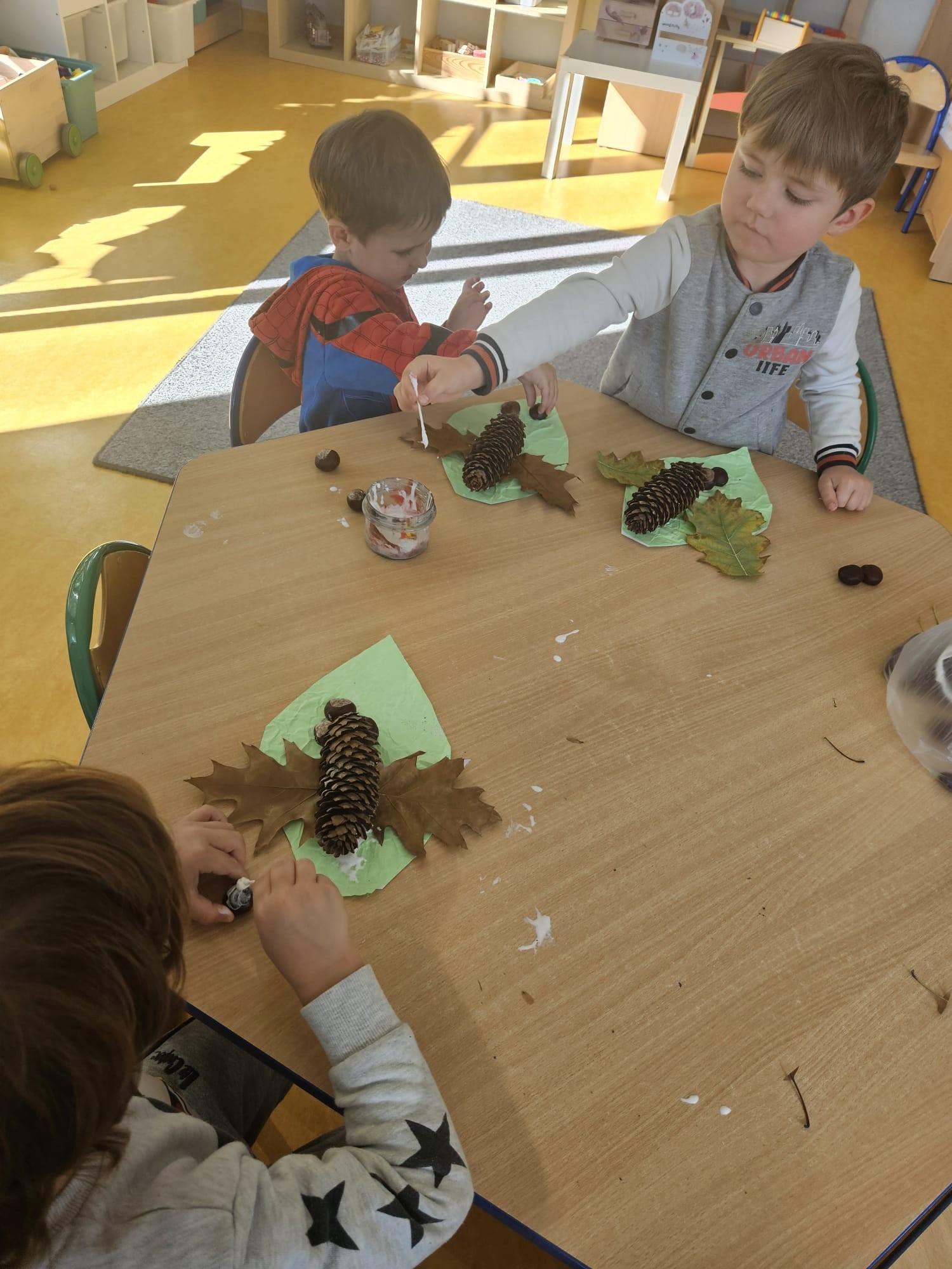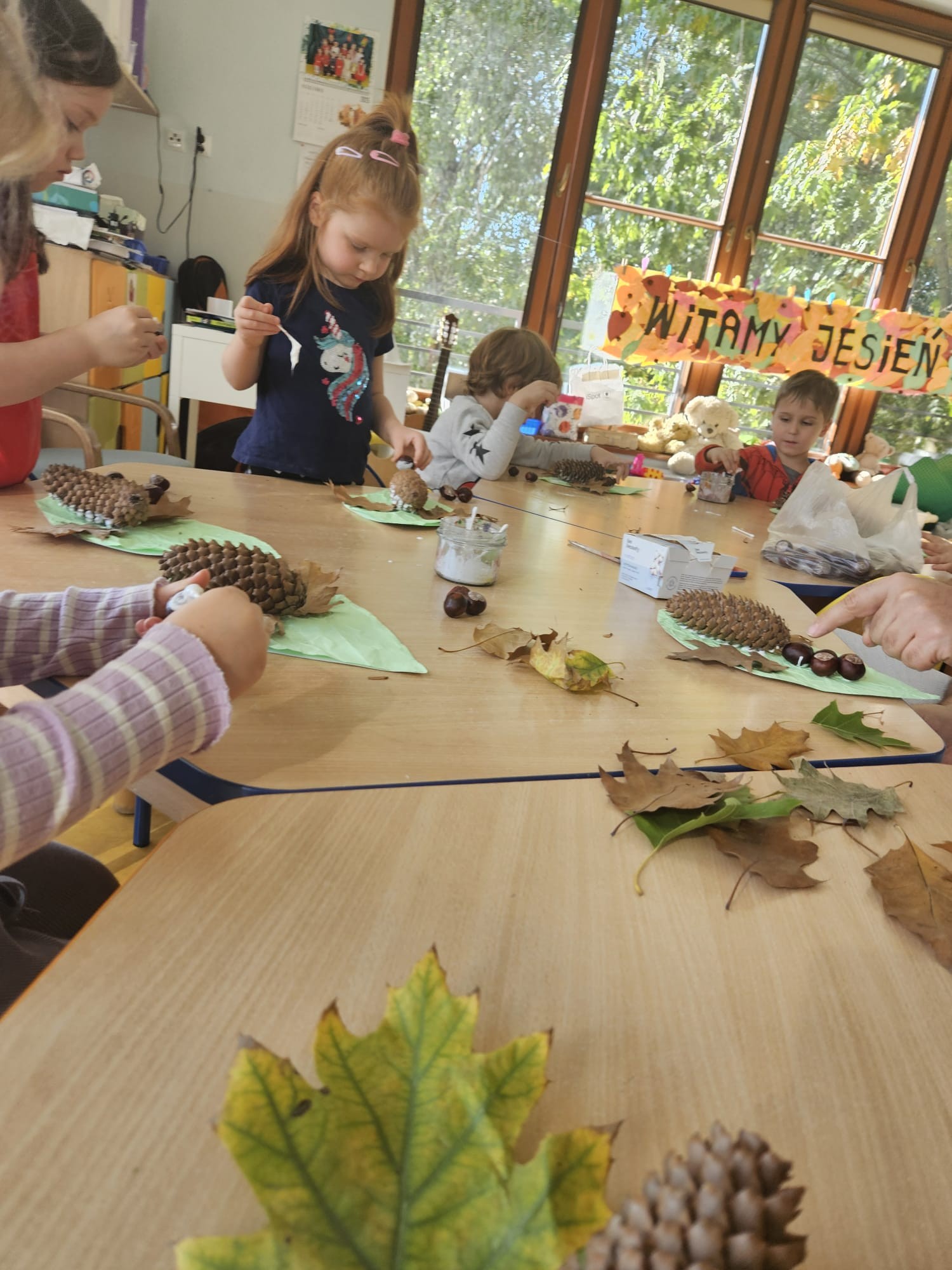 Na listku jesienna pszczółka wykonana z darów jesieni pozbieranych przez dzieci. Ale była zabawa 🙂